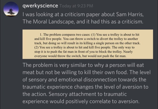 The potential impact that an individual has on the desires of other creatures, increases moral value of that individual. Desires are all that matters. The concept of “what matters” is based and defined by desires. If we desire to eat meat, it eliminates the desires of the animals of meat. This erases all potential for future desires in that animal. Including equivalent desires such as eating food. If you decide that your desires matter more than another for an arbitrary reason, then others may decide and deem your values as lesser also for arbitrary reasons. A reason is arbitrary when it has no logical connection to the value in question.