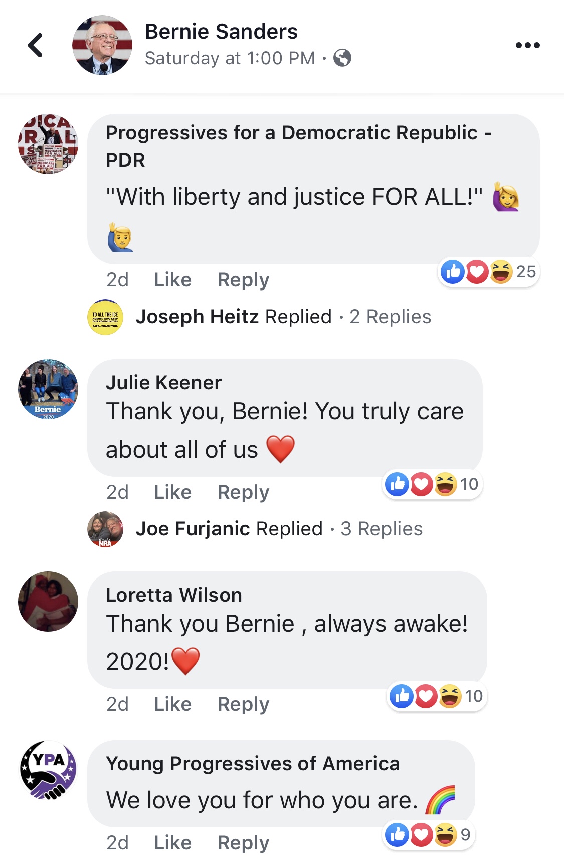 Next I searched Bernie Sanders page in order to investigate further. One post on LGBTQ stuck out. The general trend in this comment section was full support for Bernie Sanders. My sexual orientation is listed as straight on Facebook and generally speaking it is straight individuals who are most likely to be homophobic (duh) and so the most reliable tribal bias to show me, a non-LGBTQ tribe member, of the LGBTQ tribe’s opinion is a pro-Bernie bias. If I am straight, one could assume I have little investment in the opinions of LGBTQ tribe members and if I do have a strong relevant bias in response to LGBTQ member’s opinions as a straight individual it would likely be anti-LGBTQ. So by showing me pro-Bernie commentary coming from the LGBTQ community it can either have little to no effect due to personal/selfish irrelevance or bias me against Bernie due to homophobia. To be clear, I am not homophobic and may even be slightly bisexual or at least bi-curious (I’ve heard people get teased for this label) but I have myself listed as straight on Facebook either way.