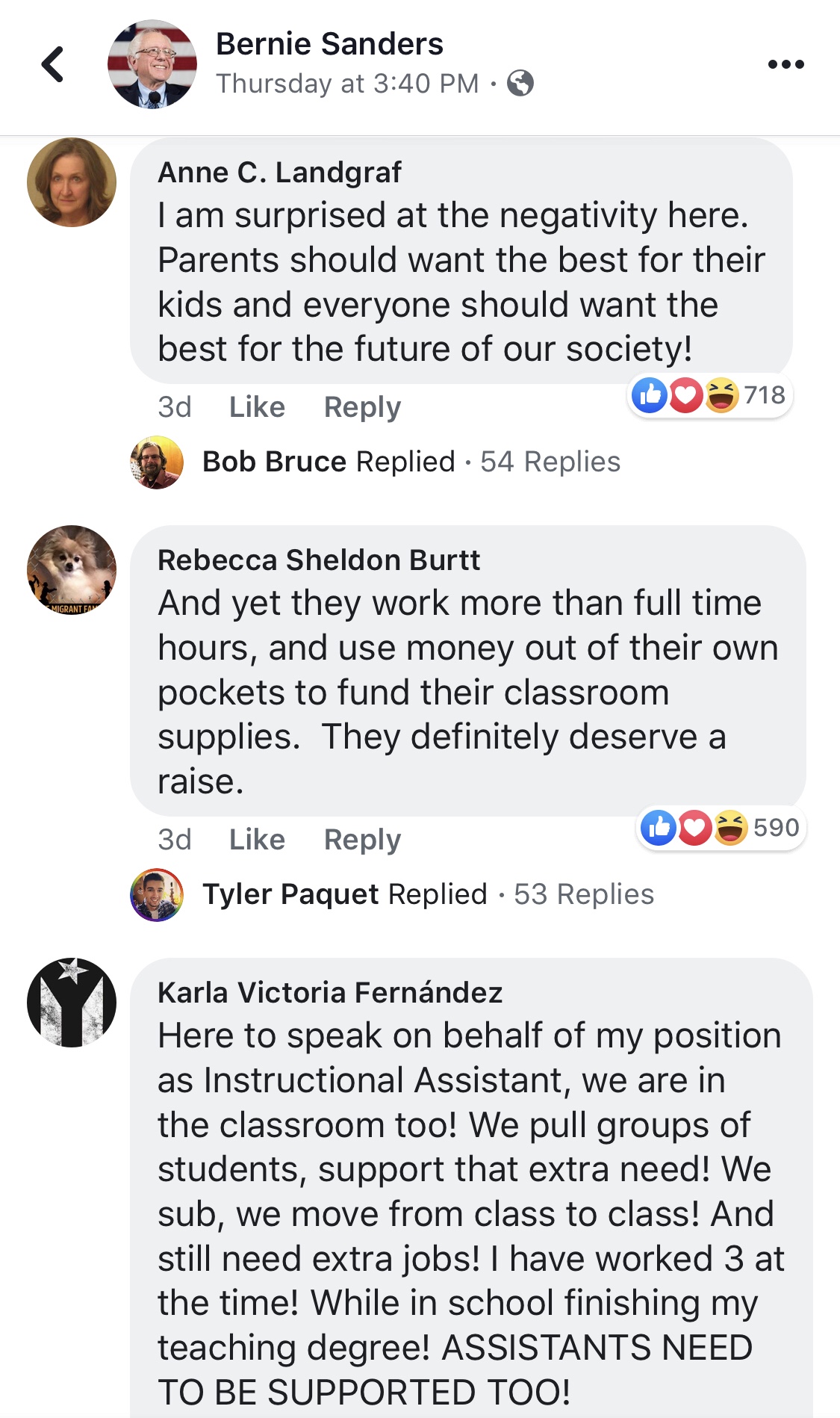 In another post about increasing teachers pay, there were many commenters noting that they couldn’t believe the negativity in the comments and yet I struggled around looking for negative comments to no avail under the Most Relevant order of comments. It could be that these people were lumped into the demographic that is supporting Bernie, as they clearly are, while the negative ones are filtered out from my demographic’s perspective. The people who are observing a plethora of negative comments might be on the other side of the demographic fence, where they are being fed anti-Bernie sentiment from their own tribal affiliation while I’m being streamed an ‘enemy’,or outsider tribal sentiment in hopes that I will also become anti-Bernie.