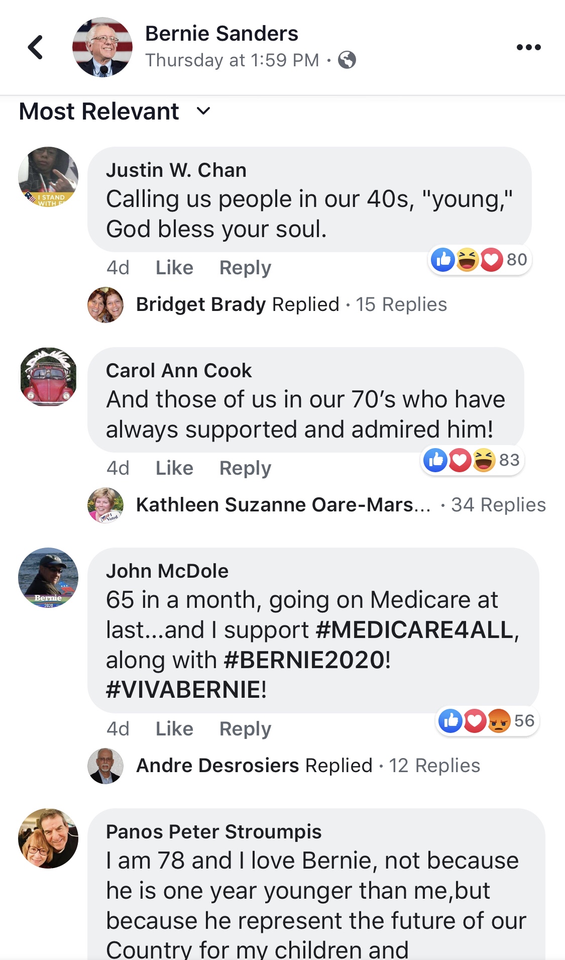 In another post on Bernie’s page, there was mention of 20-40 age demographic in support of Bernie’s politics. Strangely, the most relevant comments in this case were showing 50+ agers. It gave off the vibe that old people are going to exploit my taxes because they are getting increasingly sick due to aging. Somehow I couldn’t even find commenters my age, that is until I switched to the Newest algorithm for comment listing and scrolled way down to find a 25 year old who says they won’t be fooled into this trap. The very little comments I found in my demographic were biasing against Bernie, continuing this pattern we’ve observed thus far.