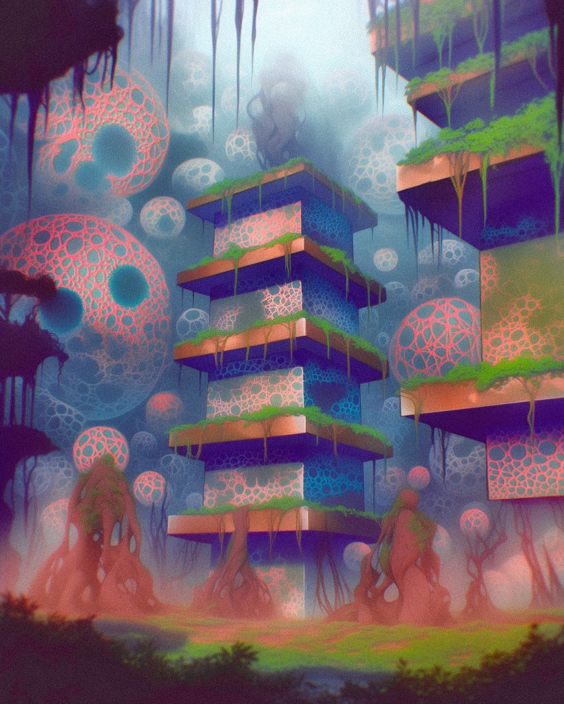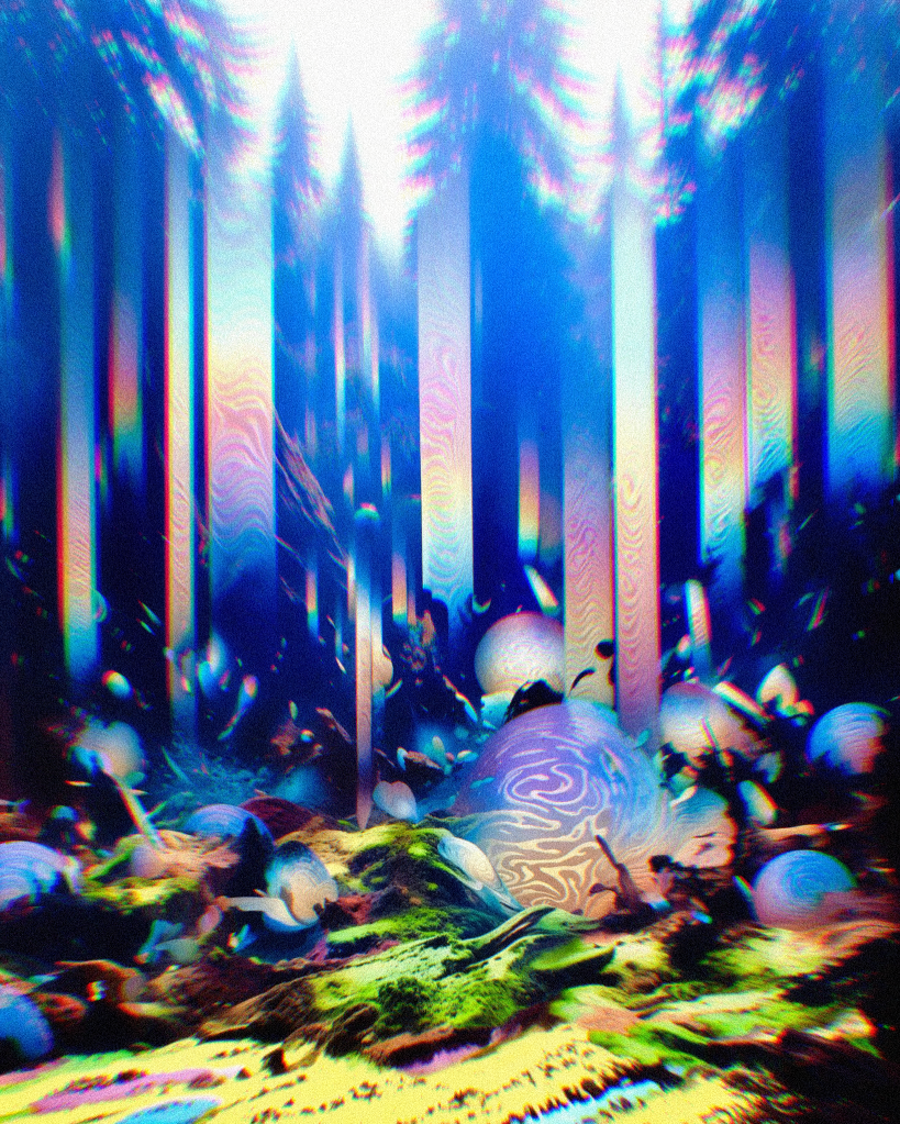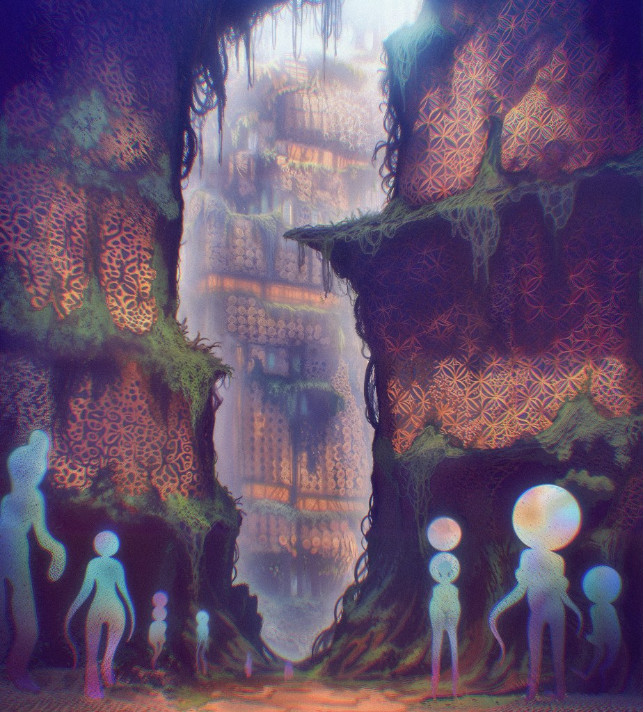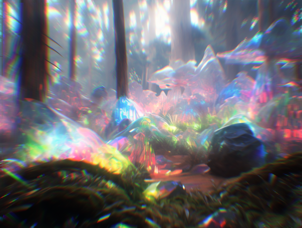 Eccentric crystalline structures sprouted from the Earth. A variety of colors and shapes decorated their surfaces. Their designs ranged from transparent holographic shimmers to opaque multi-colored bismuth. These growths tinted and bent the light of the sun, creating prismatic kaleidoscopic patterns throughout the hazy air.