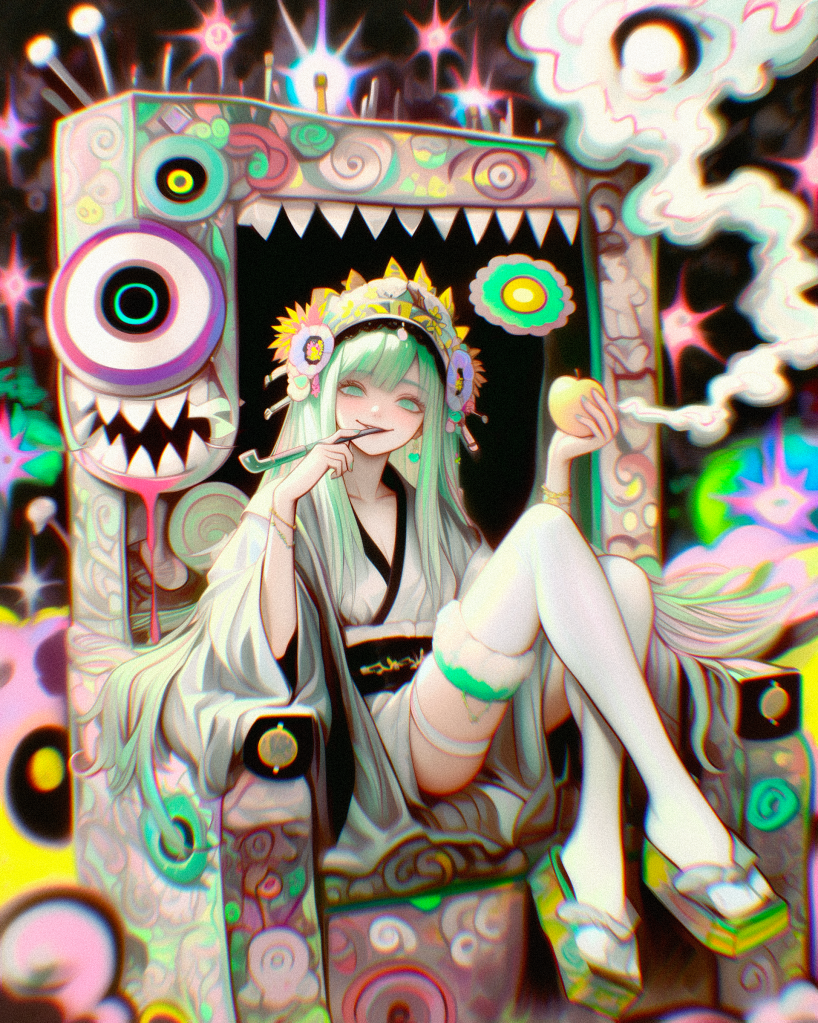 Pushing through the door revealed a line of people, waiting for their turn with a woman who laid leisurely on what looked like a throne crossed with a loveseat. Her posture was relaxed and confident, pleased even. Most enchantingly, she was the mint-haired woman who invaded my dream last night. How was this possible?? Was this truly fate? I felt frozen, spellbound, only my restless mind moved and scrambled to resolve the oddity of this situation.