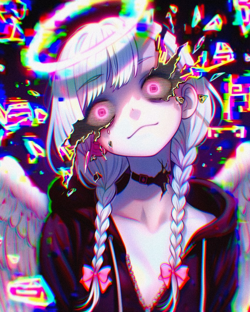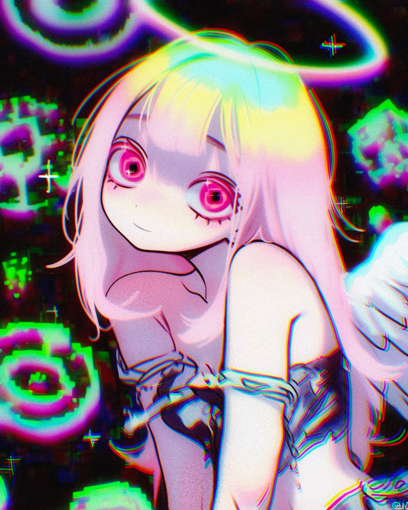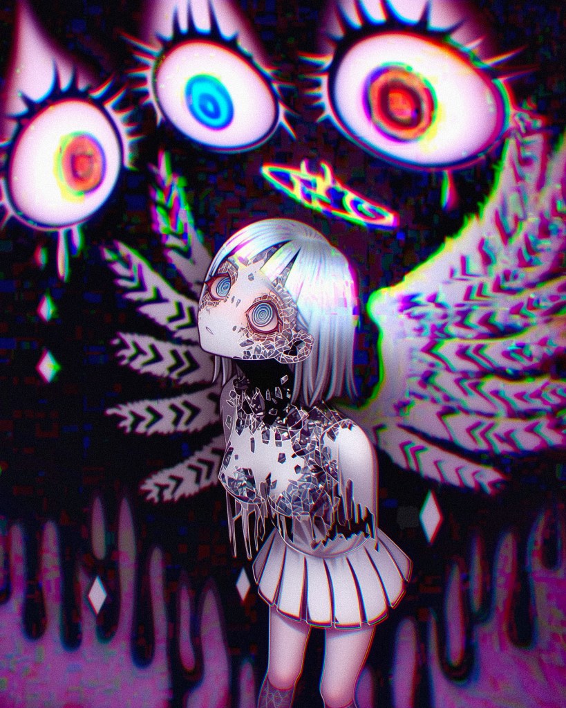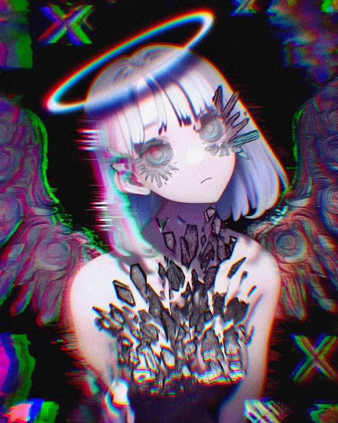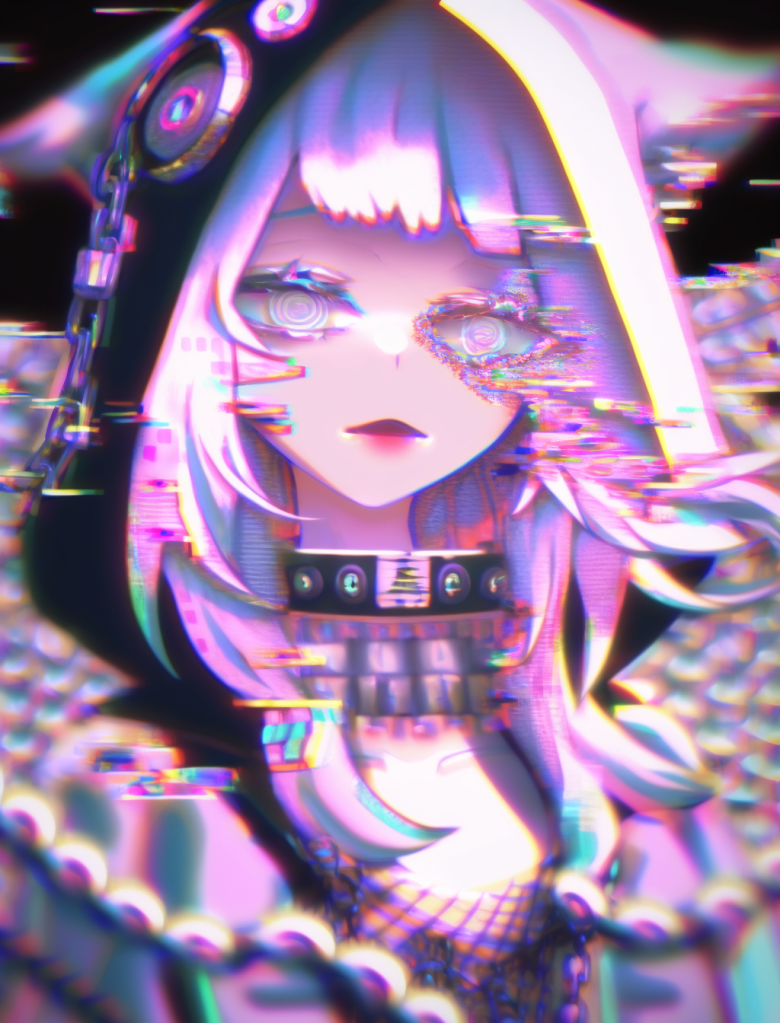 When I looked behind, it was a familiar face, though one long forgotten and distorted by what the world had done to her. She had soft pinkish hair and piercing magenta eyes speckled with cyan, her form still phasing into existence, with glitch and glitter.