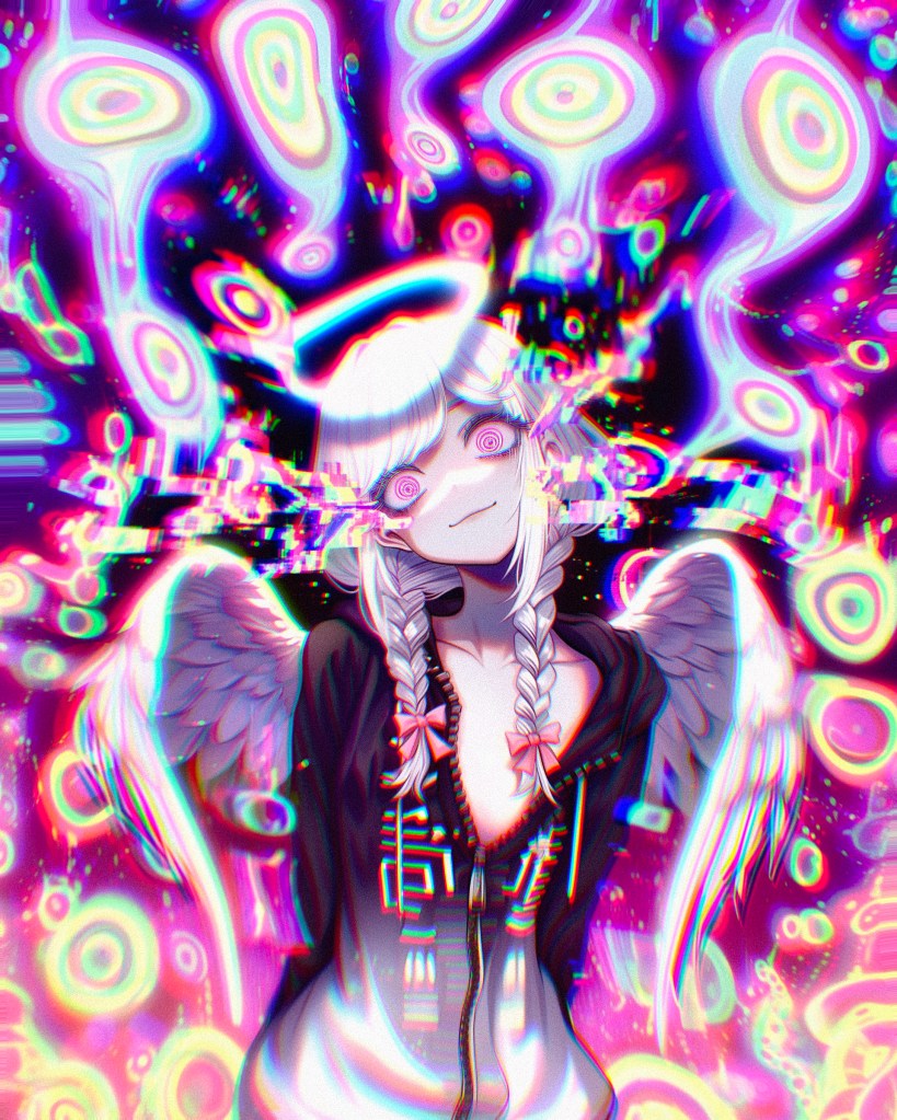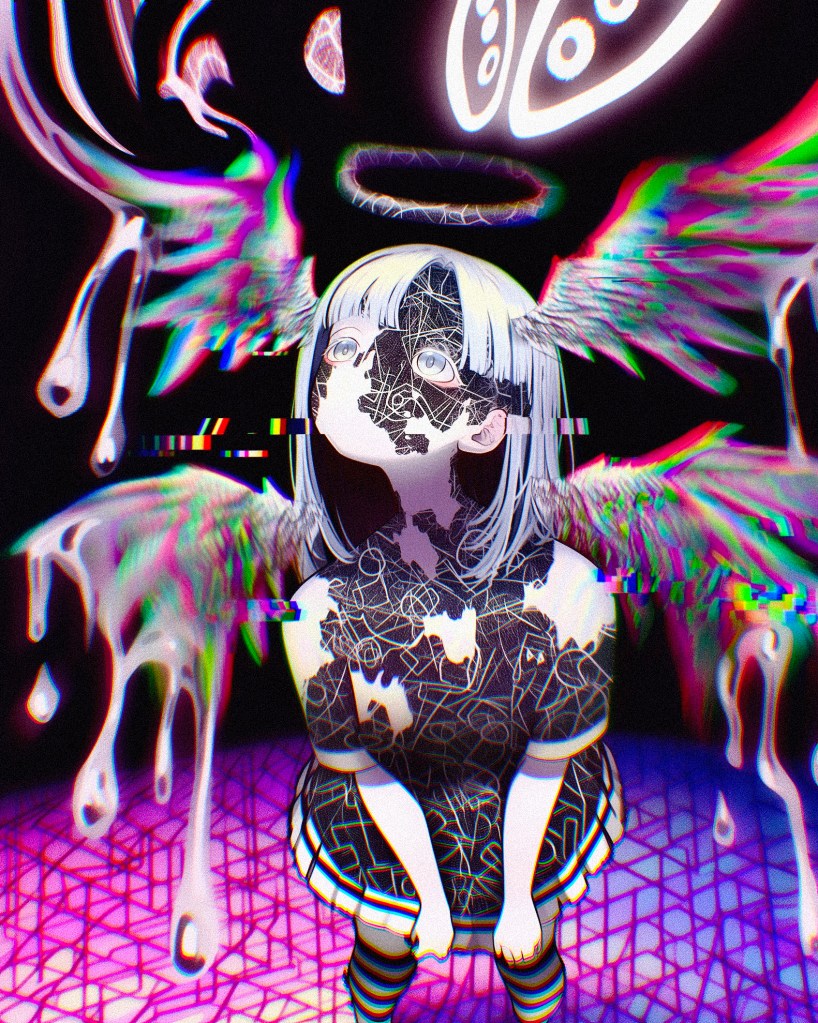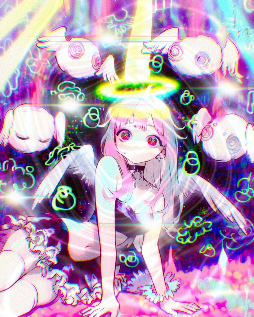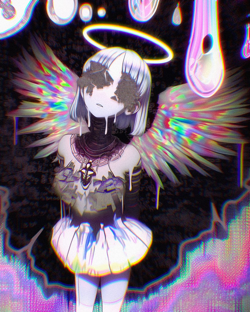 Two more beautiful chromatic Angels appeared behind her. One of them had wings that became freakish arms and was adorned only by leggings. The other wore something like a skirt, but it seemed fused with its body. Eyes floated around her. Both of them had the familiar pearly pale hypercolored skin and chromatic hair.