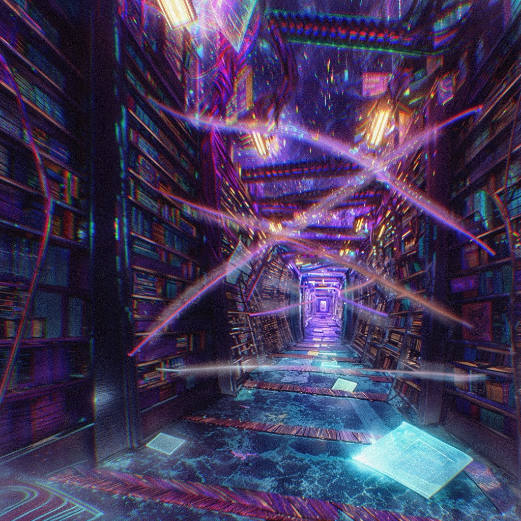 As matter and dust settled, clumps of reality formed. We were in some sort of cosmic hallway made of bookshelves. At the very end, a purple doorway awaited.