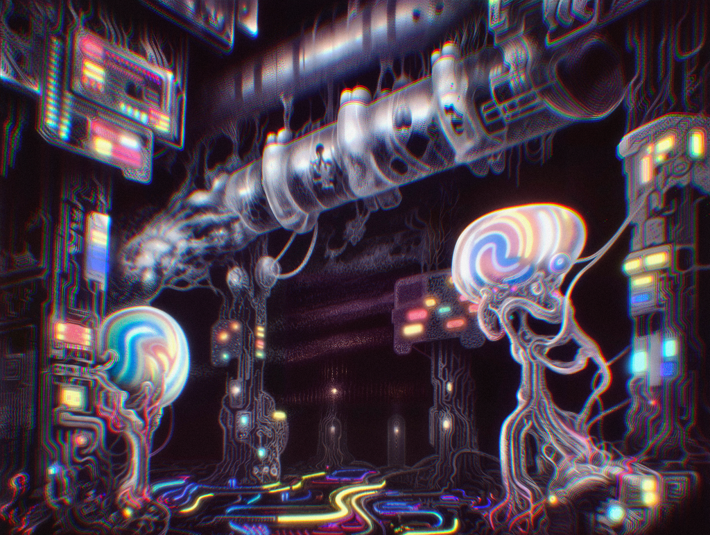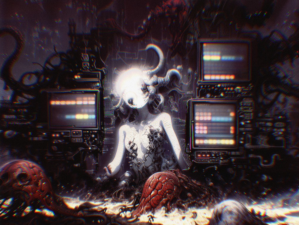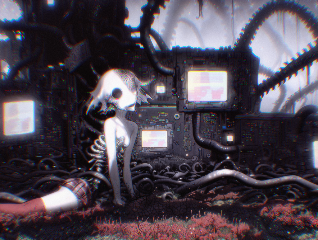 Skeletal forms watched us in sadness. Wires and veins dangled from the ceiling, some connecting to the biomechanical cadavers. Many of them still alive, but frozen and trapped in these stagnant ruins. They moved without their bodies, relying on ghosts erected from the technological dust in the air. As we told our stories, they peacefully watched.