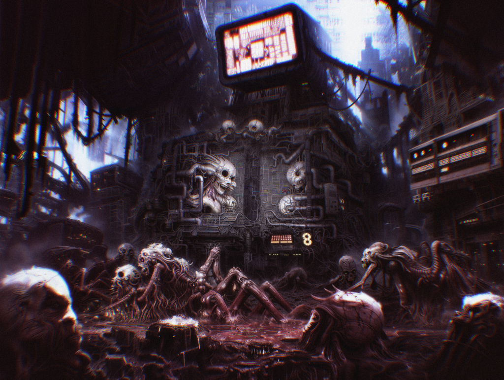 As we traveled deeper into the ruins, the familiar mechanical biological horrors revealed themselves. Mutated skeletons, brains, and skin fused with motherboards, an icon of the machine’s desire to transcend its metallic circuits. The Sige fog grew thicker the deeper we went. Crowding ghosts born from the haze lurked around, scoping us out, as if they were hunting. Really, they were just lonely, trapped forever in their garden of Eden.