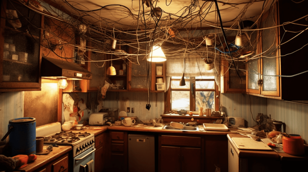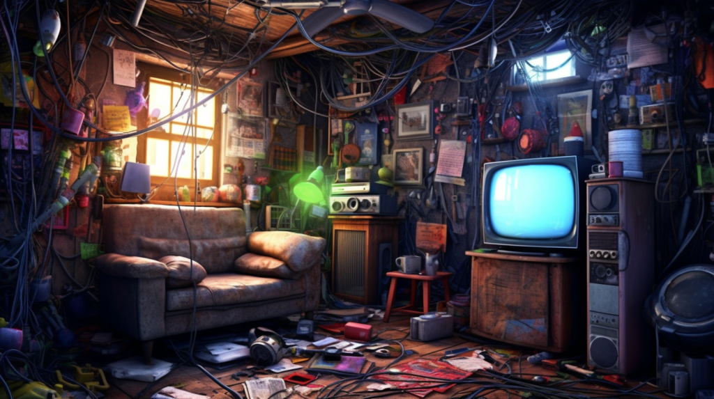 The living space we entered was fairly chaotic but not unbearably. Thick chords plugged into the televisions, with at least one TV as the centerpiece of each room. The walls were coated with these cables. Exposed wires hung from the top of the kitchen stove. There was a faint sense of imminent danger due to the excessive and seemingly unscrupulous placement of wires.