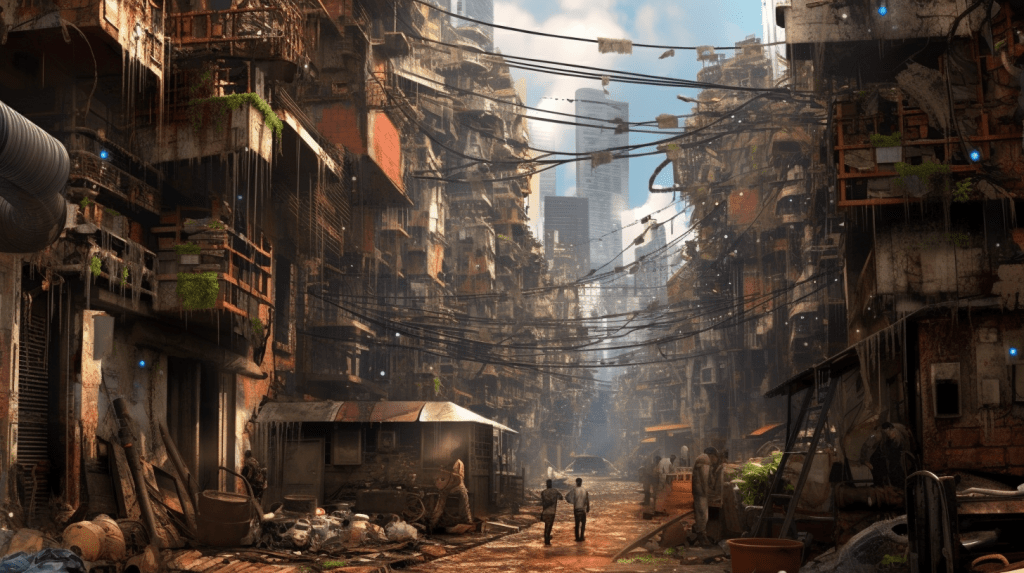 We’ve finally reached Colony 25. The mystery was about to reveal itself. We walked through the doorways to the sounds of a bustling community. Lights of various colors highlighted the dim walkways. Food vendors lined some streets. Parties were occurring in all directions. There were roads covered in trash such as metal pieces, broken electronics, and plastics. Puddles of water emitted banked aromas of a sweat-like smell. Small living spaces stacked up at least four or five stories high, wound together with thick cables. The cables were reminiscent of the organic design of the forest. It wasn’t horrid but unexpectedly less pleasant than I imagined.