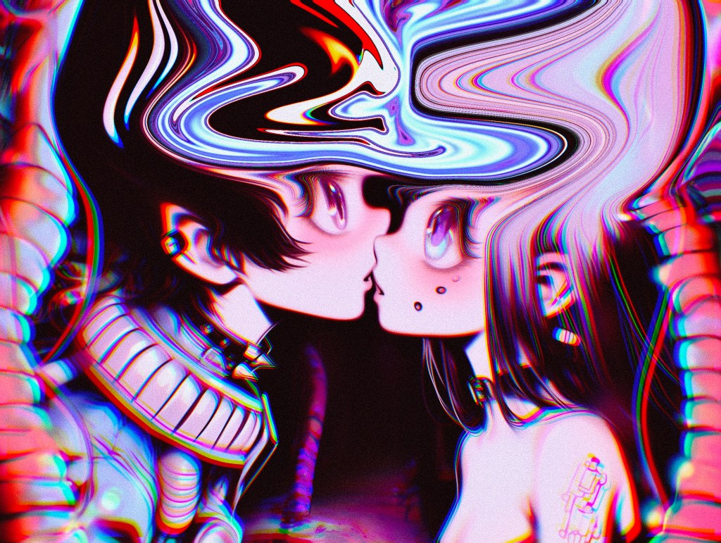 She giggled. “Poor Guhya, I’ll save you…” She pulled me in, and our lips touched, softly at first, then we simultaneously sank deeper, our tongues dancing, or even fucking. Pink, green, red, and yellow swirled in my mind.