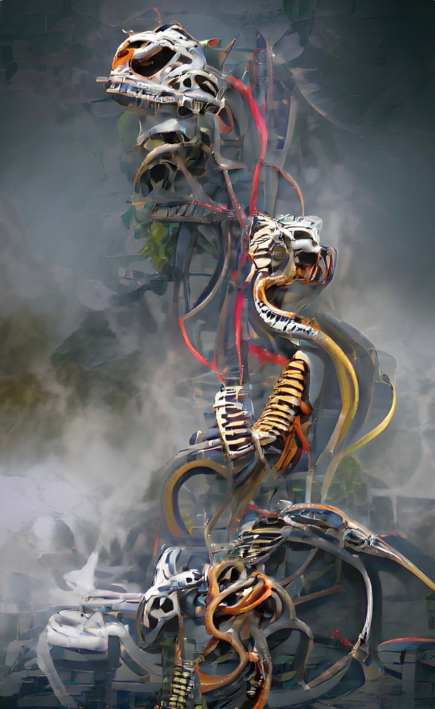 The red glow turned back to white and the fog began to dissipate. The clearing air unveiled a monstrous demon. This creature had a head like the skull of a serpent, red and yellow cables connecting skeletal snake-like pieces of metallic body sections. Its form twisted and tangled, with divisions of segments merging into one another as if two necks joined as one. I froze in fear at the sight of it. It froze as well, which was about the only comforting thing about it. Was it dead? Was this merely a carcass? I hoped so.