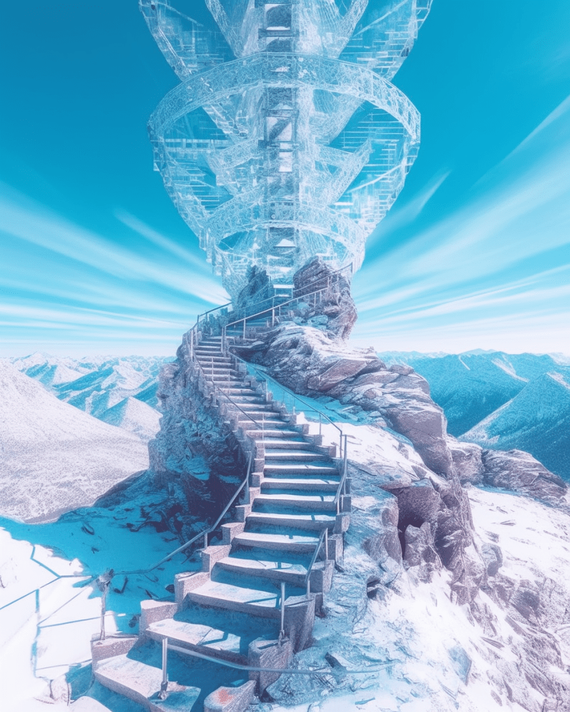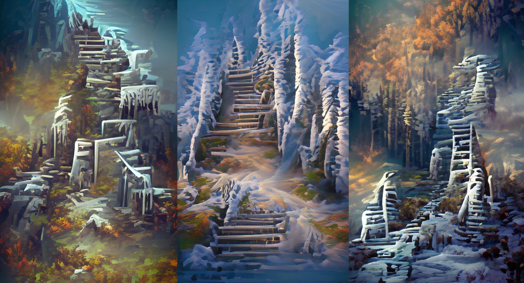 We continued walking along the stairway that circled the mountain. Forests blended in with frosty snow. Some of the stair pieces molded into archways. Some stacked upward like fragmented obelisks. The stairs looked like they were generated incorrectly. As if they were glitching and we were living in a broken simulation. Anything seemed plausible at this point.