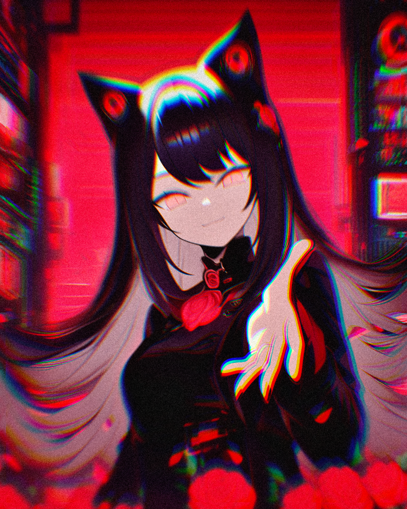 Still stunned by the wounds from Iniko, I merely stared. She seemed pleased, yet also deadened and neutral. As if her soul was leaking out of her body in a slow drip. Long black hair prettified her head, with bangs drooping nearly to her eyes. To match her hair, she wore mostly black but accompanied by some flowers and chains.
