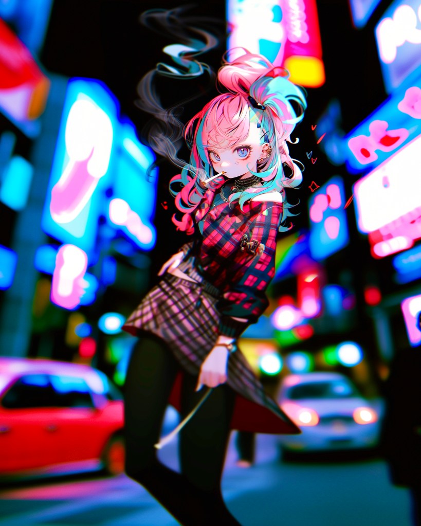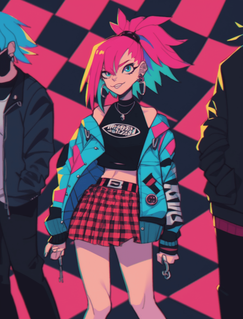 Their styles were different from all the others. Their ponytailed pink-haired girl, front and center, decorated herself with a checkerboard skirt, black and red. Her jacket was teal and pink. Her shirt was basic and black.
