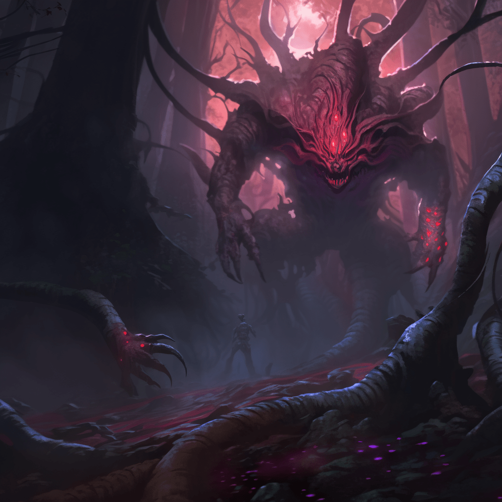 Behind him, something massive rose up. My vision vibrated and odd shapes checkered all over. It was a beast. Its skin was like bark: folded, wrinkly, and tough. Long pieces protruded from its back. Glowing red eyes chaotically sprouted all over its face.