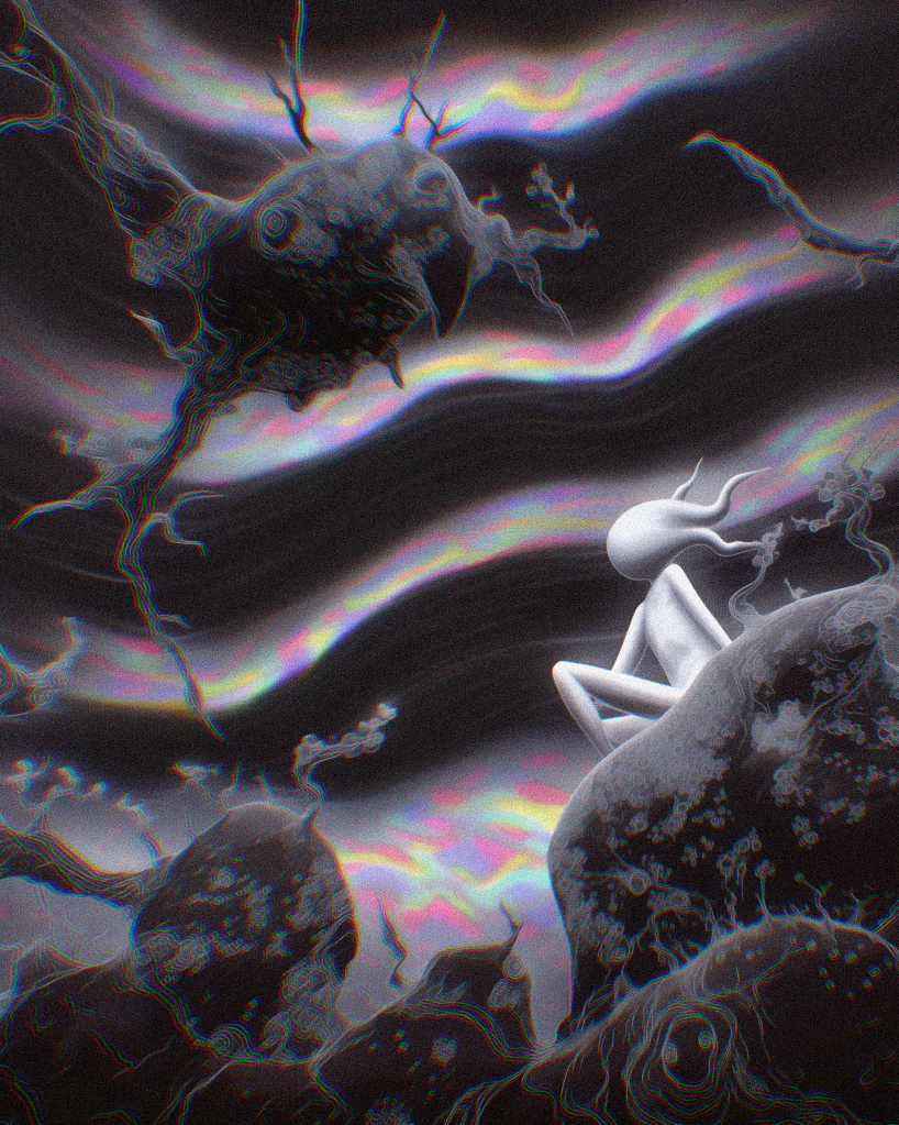 Frantically, I ran through the garden of the void. Each stamp irradiated in a variety of colors that faded as fast as they were birthed. Pulsing echoes of each pounce of my foot slamming into the “ground” produced visible traces of warped space.