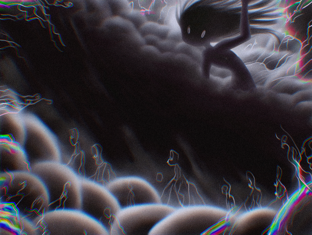 The swirling space hole dragged me through, but this time, I didn’t seem to land anywhere. Pure blackness encompassed all. I felt a floor but didn’t see it. I saw my body, but nothing else. Far above, boiling black clouds bubbled about. An entity’s presence was felt.