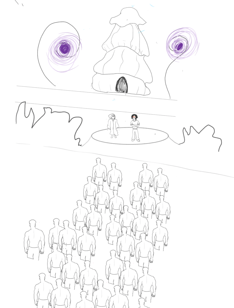 The commotion was right around the corner. It was like a speech or some kind of ceremony was being held. We observed from a distance. A crowd of seemingly identical, hyper-masculine, strong guys gathered around a stage. On the stage, there was a hooded-robed figure and. . . the guy I saw while on the train in Colony 25?? He had the same piercing red eyes, medium-cut black hair, and disturbing smile.