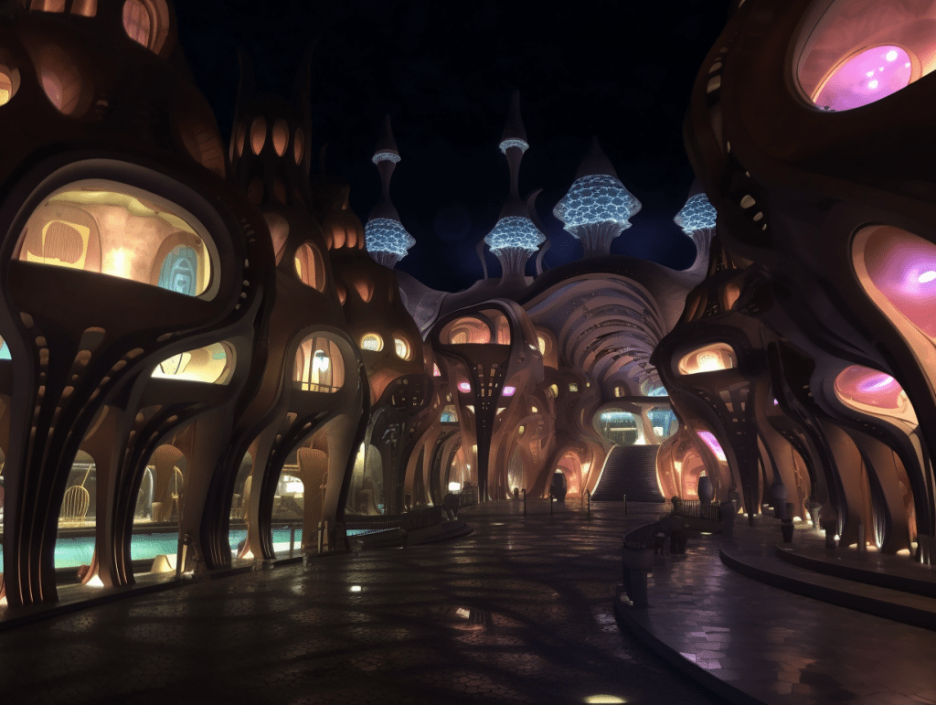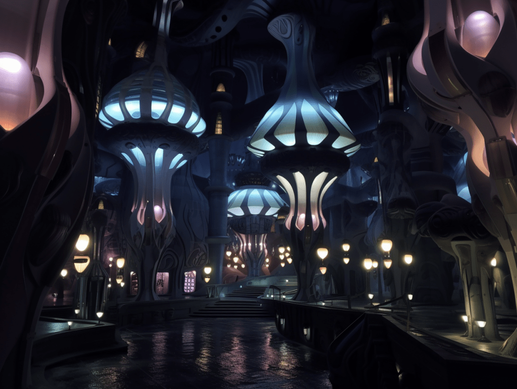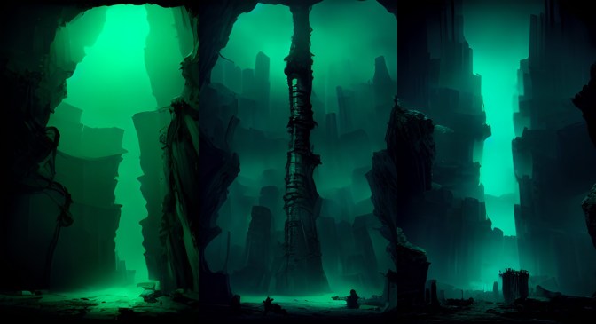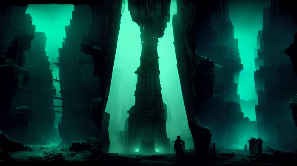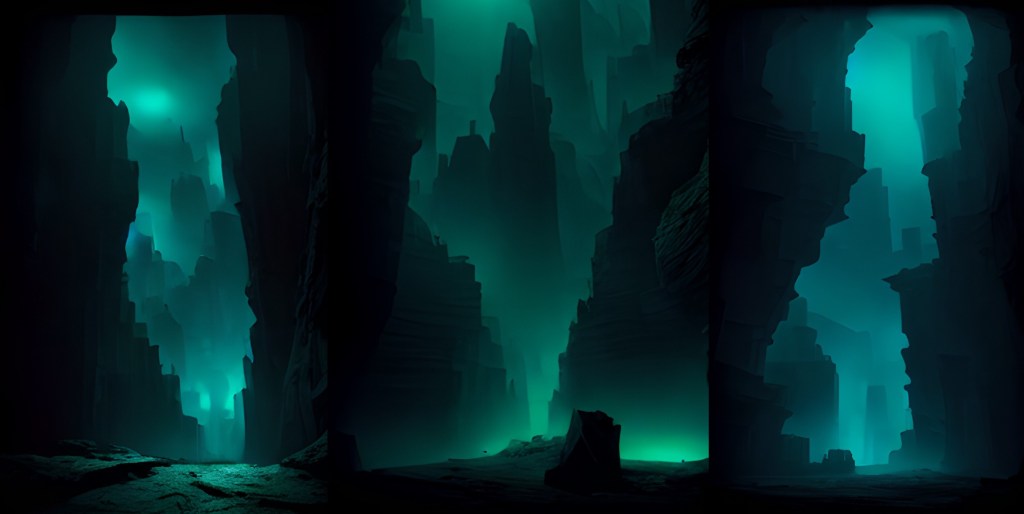 The abandoned city was comprised of strange structures. As Nell mentioned, they resembled termite colonies. The buildings mirrored the stalactites of the cave, though, the immensity of this area didn’t permit the visibility of stalactites. The ceiling seemed endlessly distant. The central tower was cone-like, but much curvier than any ordinary cone, again, like the shape of stalactites or termite mounds. The surface of the tower seemed to ripple and wave, contouring in and out. The material of the city was like obsidian, some sort of black rock or metal.