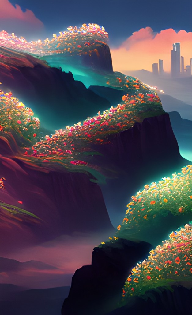 We parted ways. Guhya followed me. We passed through the streets of Hedo, pushing through to the end, finally arriving at a beautiful endless garden in the hills and cliffs, with the far side of Hedo peeking through. The last light of the sun colored the clouds, backlighting the skyscrapers. Gaps in the landscape filled with an ominous fog like a sea of clouds.