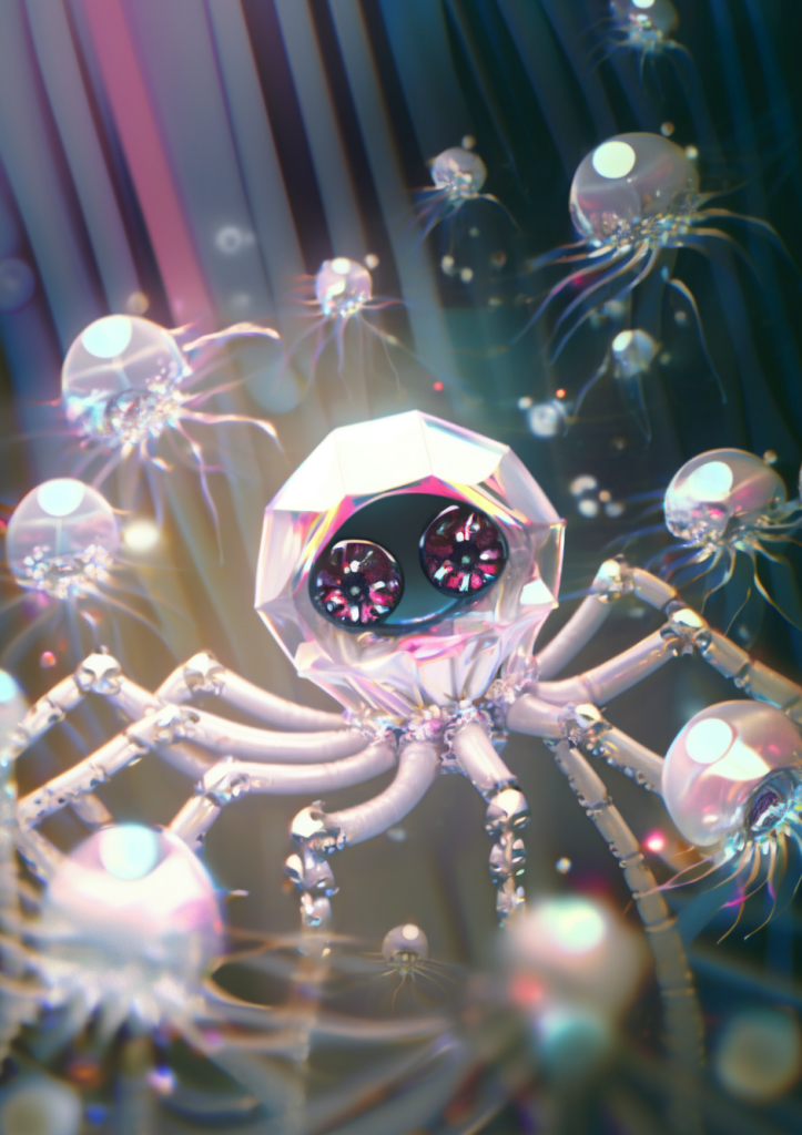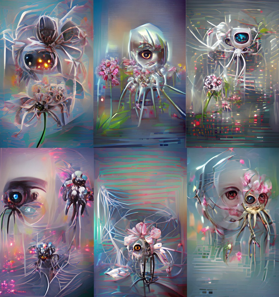 Upon waking, it was clear that we weren’t in the same place. This room still contained flowers, but we were surrounded by surrealistic spider-like creatures. Their bodies looked pearly. Most of them had a single human-looking eye. Some had more eyes or weirder eyes. A few had flower petals stemming from their bodies. Even stranger, one had a faint transparent human face attached to its abdomen.