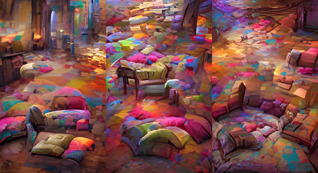 She continued by closing her eyes and putting her hands together. Suddenly, pillows started to stack high up, building a vast soft labyrinth. Palm trees sprouted from the pillow floors, making the scene prettier. She smiled at me then tapped my chest and said, “Tag! You’re it!” and started running through the maze.