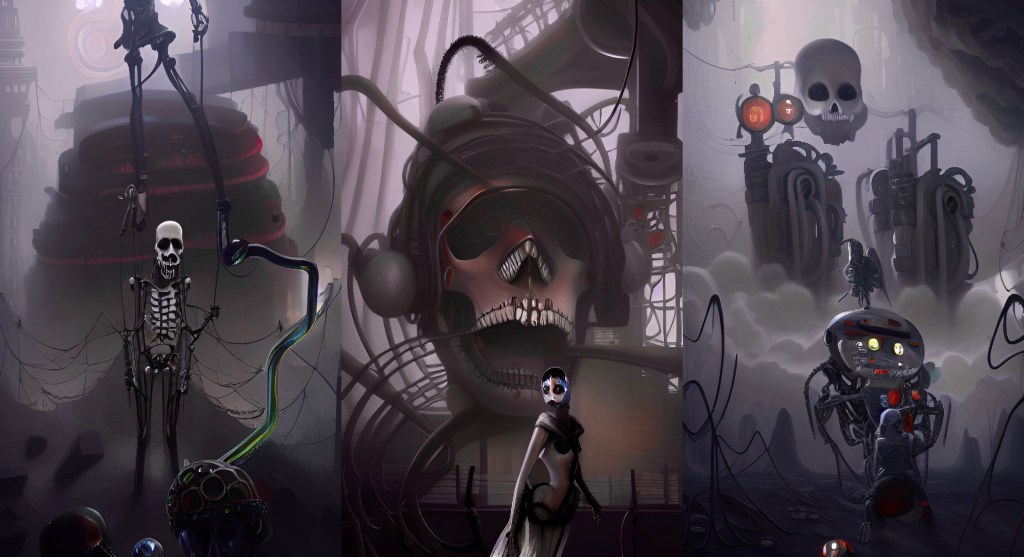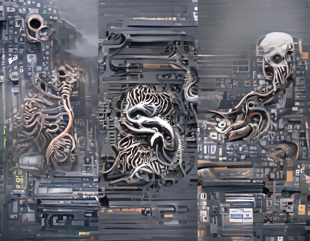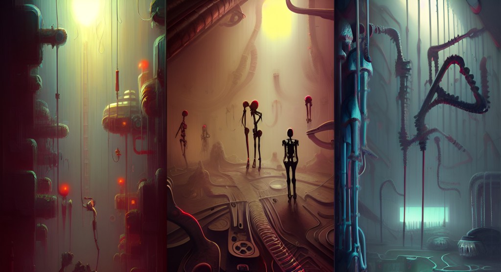 The wall in front of my line of sight was a hellish monument. It was a massive computer’s motherboard, yet, biological structures were fused to its’ various parts. It looked like some kind of twisted human skeleton, though significantly mutated. I silently pointed everyone to the bewildering mural.