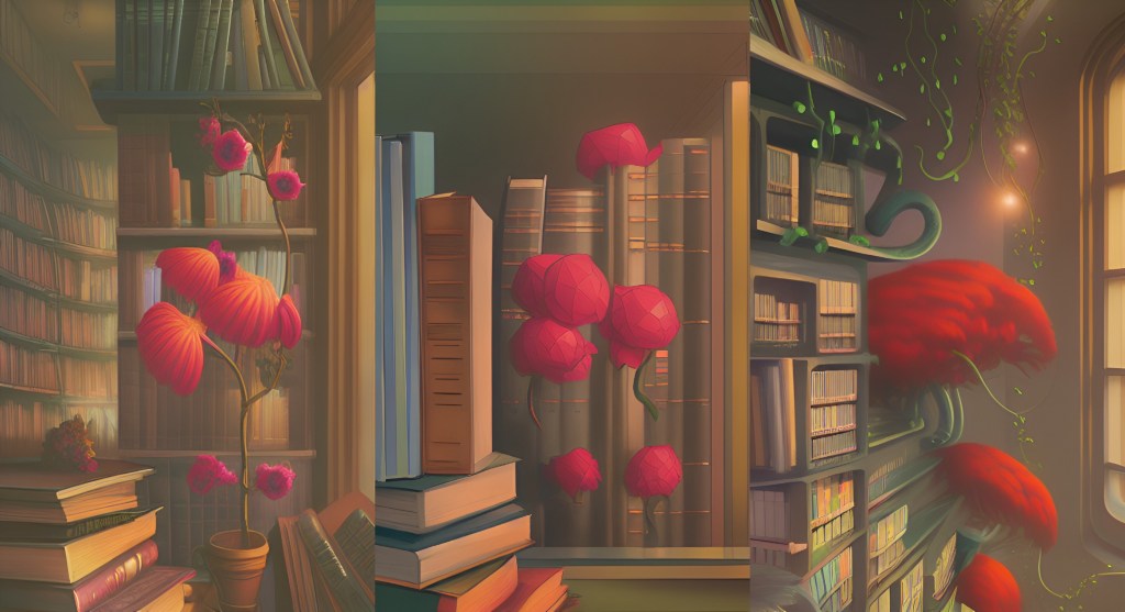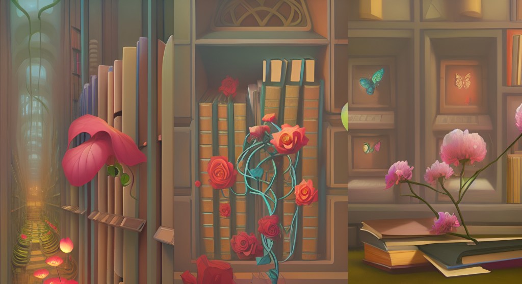 The new space was a massive set of shelves with books that grew flowers from their pages. Walls were decorated with sealed frames with butterfly corpses. Some isles had strange sculptures. One isle contained a robotic “mask” with goggles and butterflies swarming around it and another isle had a pair of human legs that functioned like a flowerpot. It was an odd sight. I suppose this was better than cobwebs and dust burying the books in pseudo-graves.