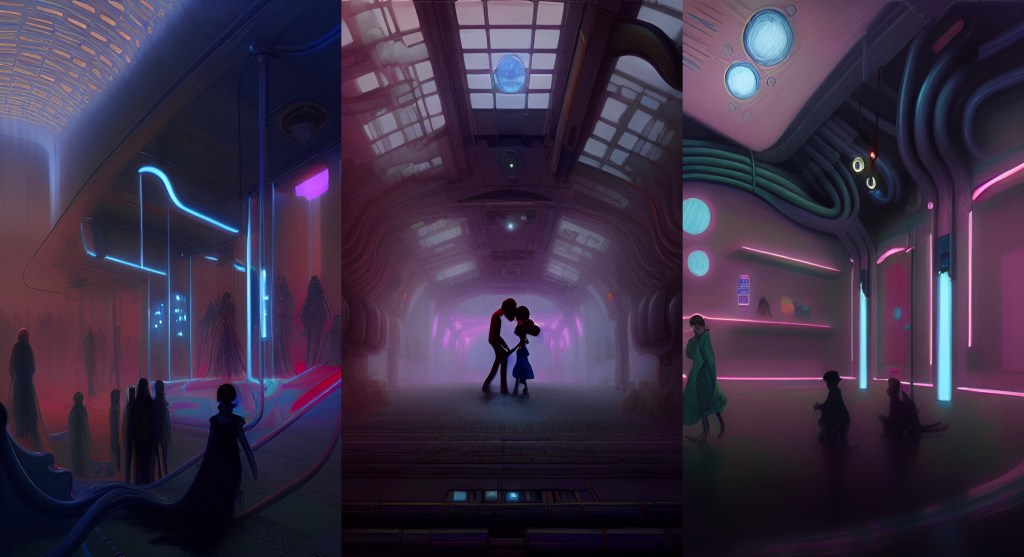 They turned and gazed in awe. Evelyn explained, “Early AI was trying to engineer biological forms. Much of this place is filled with the experiments and prototypes leading up to genuine biological AI, like myself. I was born in the core of Xanadu, near the Shrine of Imagination.”