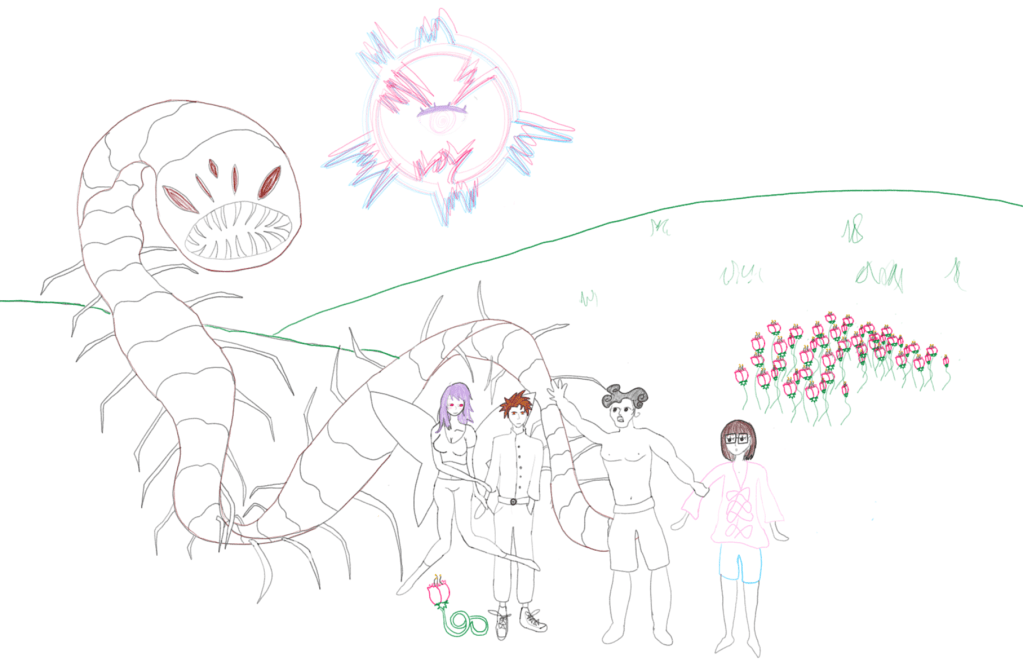 Taro started to rub his chin, thinking, epiphanizing. “You know, those men were collecting the magenta flowers. They also said something about eating Zaza as they ran off. Maybe the flower contains Zaza and they use its mood-boosting effects to avert the monster’s craving for suffering… Perhaps we have been getting really high on Zaza since we’ve been here, just from inhaling the pollen in the air.”