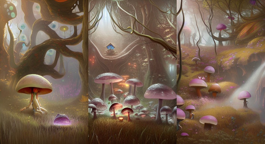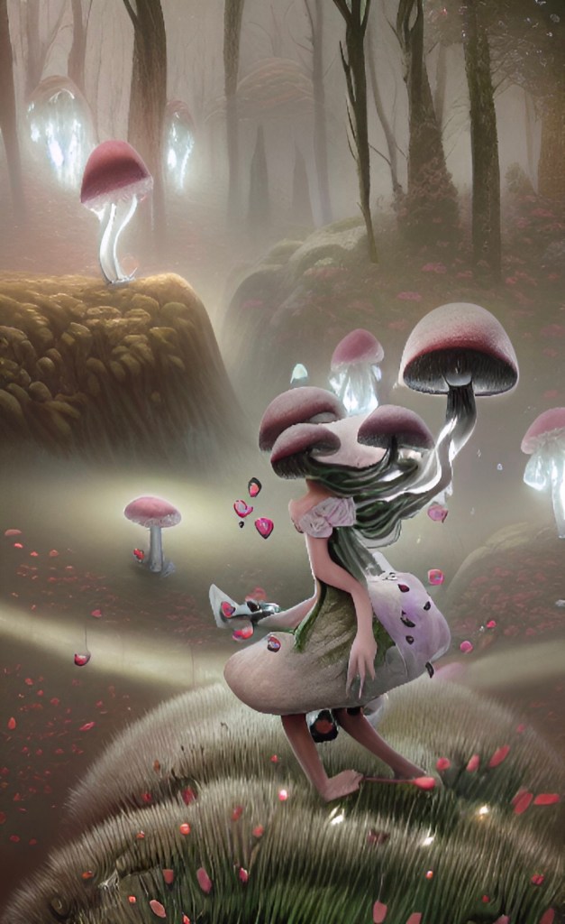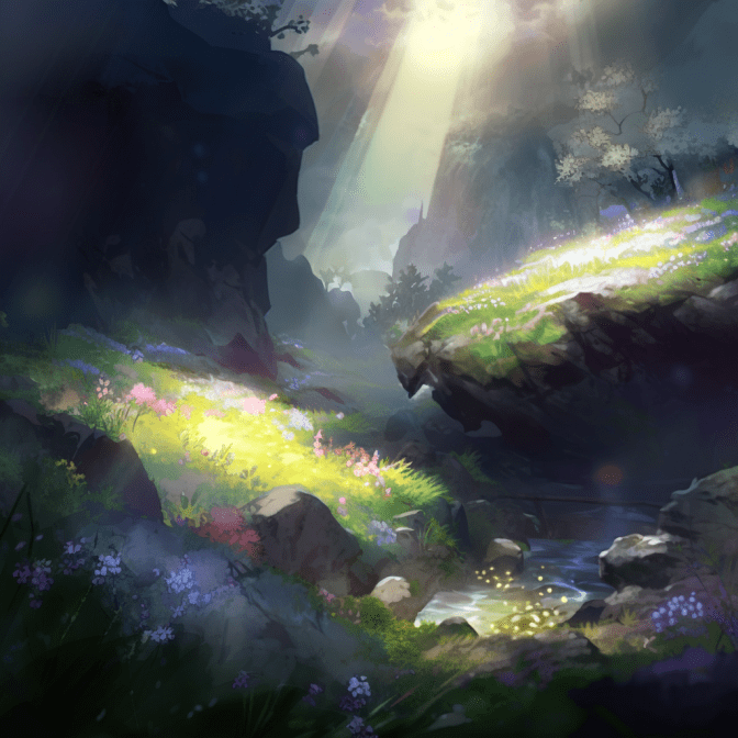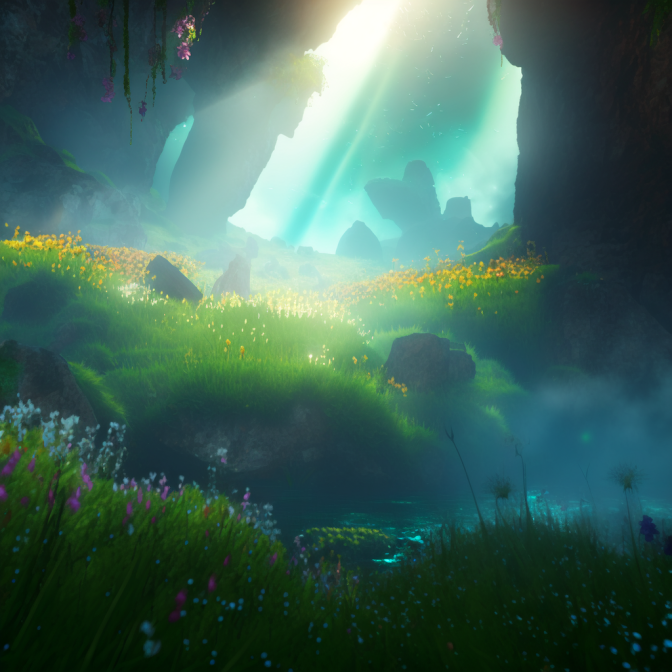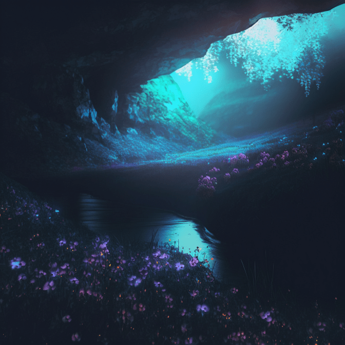 She struggled and we wrestled until eventually she pushed me off and our eyes locked as we lay there in the bed of flowers. Her eyes grew dazed and soft. The sparkling pollen in the air drifted around us slowly as the light of the sun began to fade. For a while, we just sat there in a blissed state, drifting in and out of reality. It felt like 30 minutes passed without any recollection. The moment felt eternal. My senses were heightened but also slurring around a bit. Starlight and glowing specks dimly lit the cave.