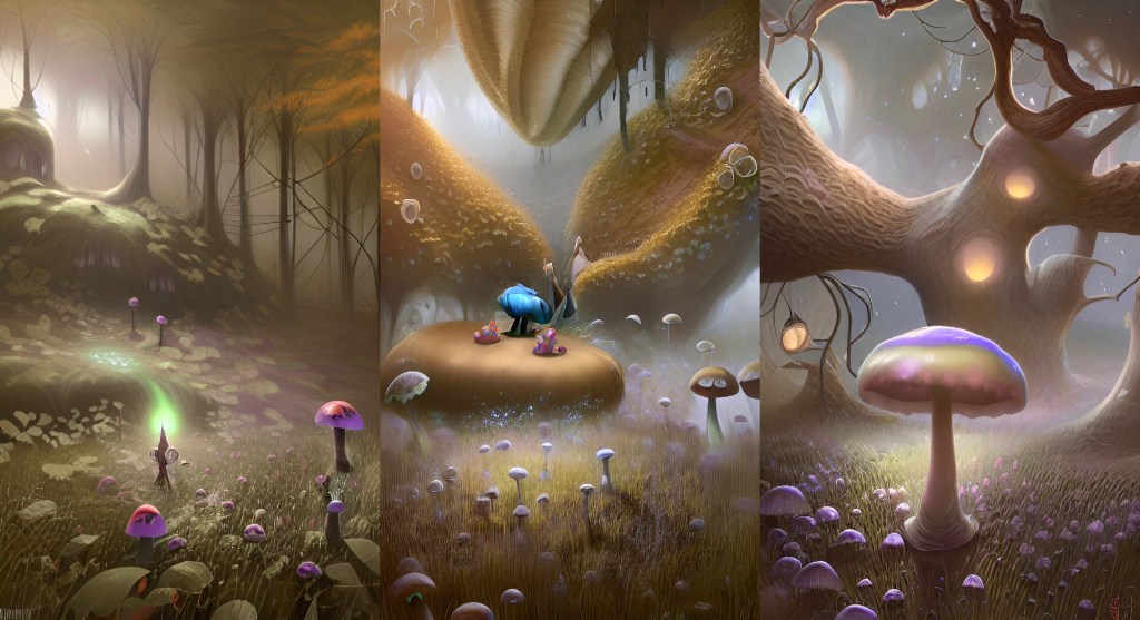 We all ran to see. After allowing my eyes to adjust, the beauty of the area sank in. An endless bed of colorful flowers coated the floor. Magenta, yellow, cyan, and purple painted this underworld meadow. Grass flowed in a gentle breeze. Rays of light broke through from the overworld, revealing floating pollen in the air. Large brown mushrooms of a few sizes and shapes acted as trees. The lakes sparkled in the setting yellow sunlight. A sense of familiarity and deja vu kicked in.
