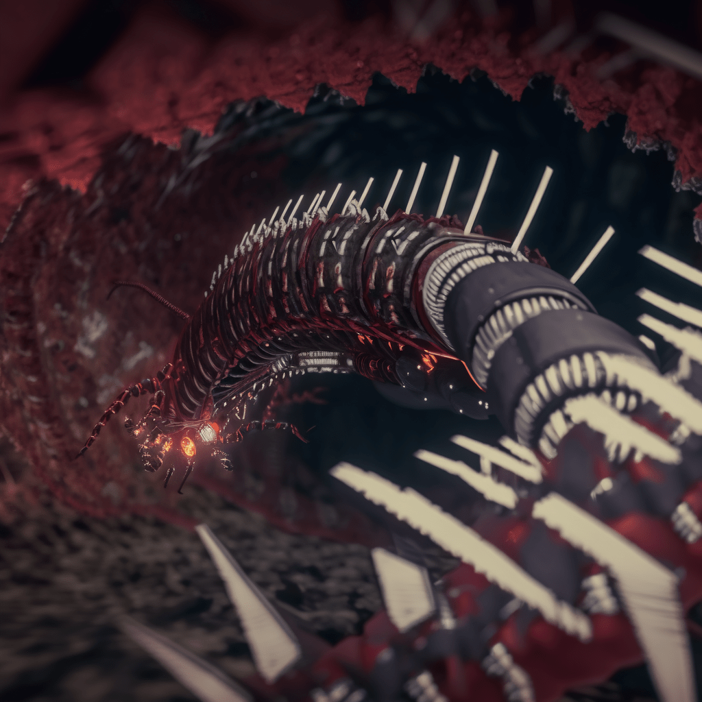 Seconds later, an explosive hole burst open in the cave walls. Out of the dust cloud, a crazy fucking centipede creature came rushing towards us. It had razorblade teeth, deep blood metallic skin, and a seemingly endless body with tons of legs.