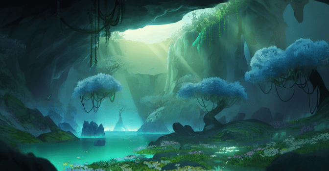 We began our long journey in this magical underworld. Glowing specs of green light coated the edge of underwater lakes and rivers. A fresh scent wafted through the tunnels, luring us towards an opening to a larger cavern. Light burst through from the end of this aromatic tunnel.