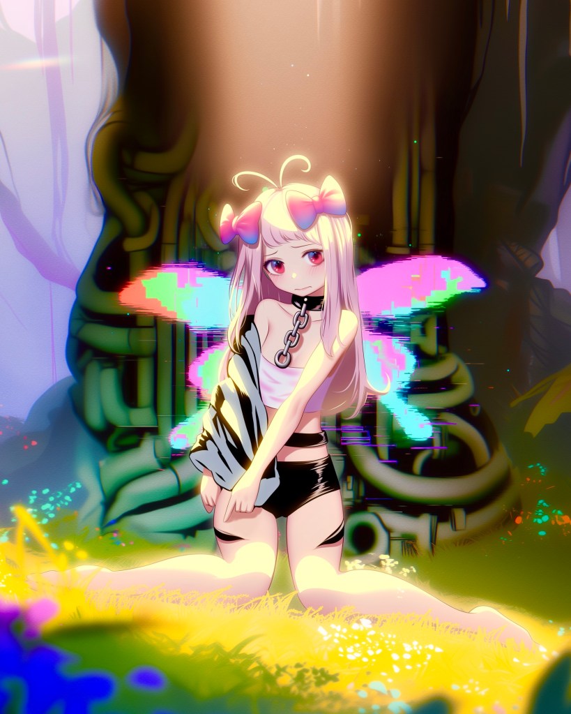 Evelyn stood before me in her lewdest state yet. She took the form of a fairy. Antennae came from her uncomfortable-looking face. Wings grew from her backside. A shirt that exposed her breasts covered a tiny portion of her top half. No pants covered her bottom half, only some ribbons, high socks, and shoes. The lust that her appearance produced was uncontrollable, yet her expression was strongly deterring. Her folded arms gently reshaped her breasts, I didn’t want to look away but she very much wanted me to. She seemed bothered and almost judging, with her arms crossed.